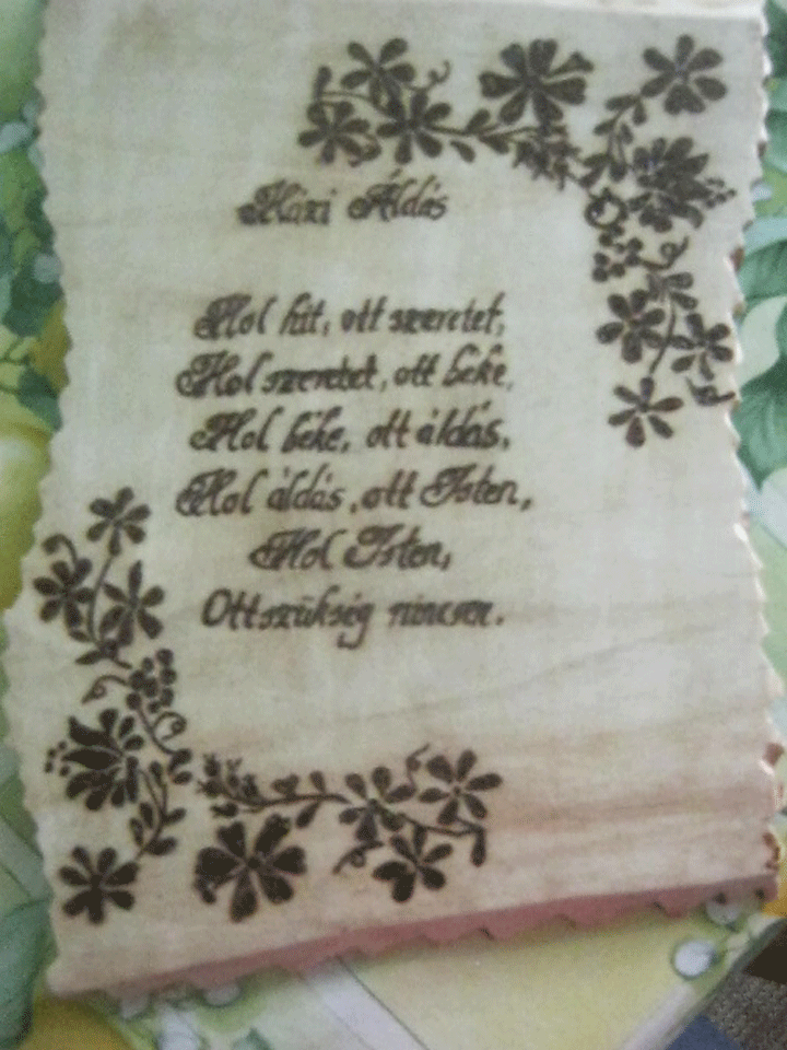 Több mint tíz éve művelem a fát, készítek domborműveket, szobrokat, égetést, ékszeresdobozokat és még sok mindent. Van öt saját kezüleg készített hegedűm is. Nemrégiben céget is nyittam a fa faragásához, neve OrnamentDecor és Bácsföldváron van a székhelye.